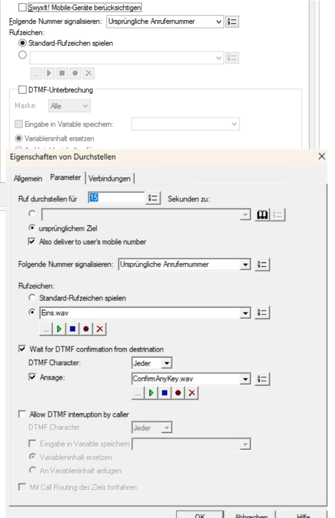 Standard-Rufzeichen spielen | Legen Sie fest, welches Rufzeichen während des Durchstellens abgespielt werden soll. Sie können das Standard-Rufzeichen verwenden oder aber eine individuelle WAV-Datei auswählen. |