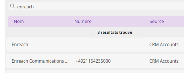 Les résultats de la recherche s'affichent dans la liste de contacts :