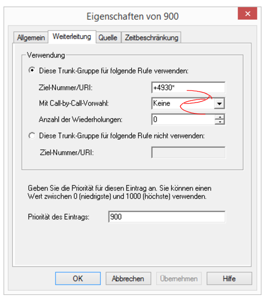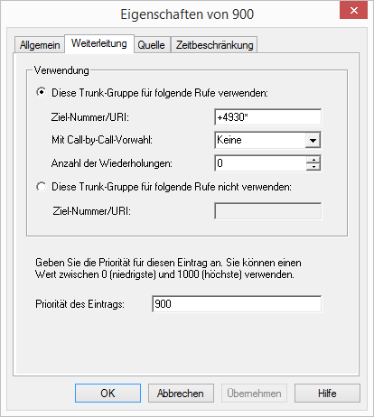 Ruf zulassen +49 30*; Trunk-Gruppe „SwyxLink Dortmund-Berlin“; Priorität 900
