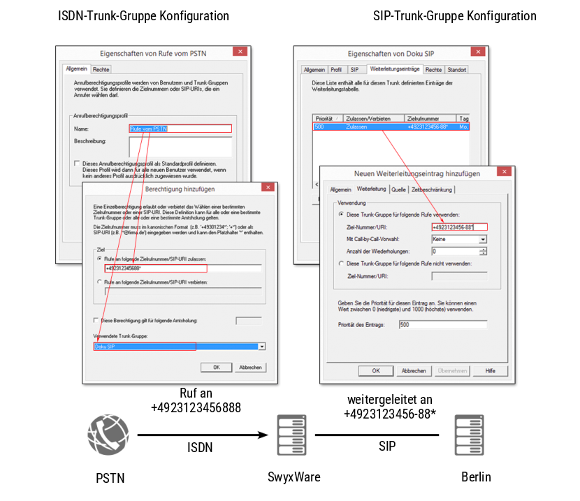 Vom öffentlichen Netz kommt ein Anruf über die ISDN-Trunk-Gruppe an die Dortmunder Rufnummer 0231 23456-888 herein. Nun ist diese Nummer innerhalb von SwyxWare keinem Benutzer zugeordnet, aber es gibt eine Weiterleitung für den Rufnummernbereich 0231 23456-88* über eine SIP-Trunk-Gruppe. Damit dieser Ruf nun auch über diese SIP-Trunk-Gruppe weitergeleitet werden kann, muss in der ISDN-Trunk-Gruppe, über die der Ruf hereinkam, die entsprechende Berechtigung eingetragen sein. d. h. dass ein Ruf, der über die ISDN-Trunk-Gruppe herein kommt, das Recht haben muss über die SIP-Trunk wieder hinaus zu gehen:
