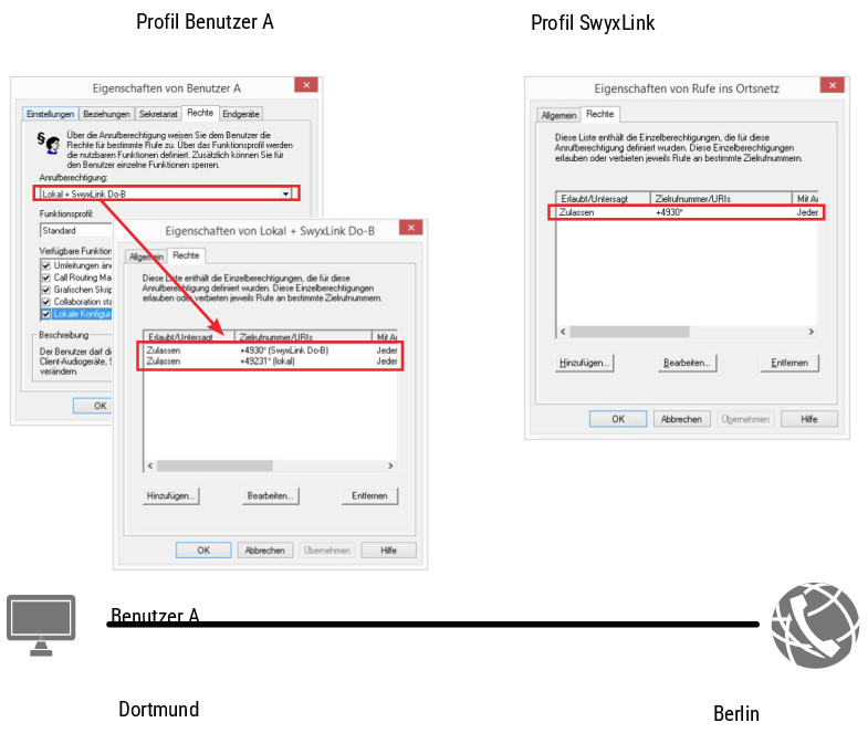 Ruft andrerseits ein Benutzer aus Berlin über den SwyxLink „Dortmund-Berlin“ nach Dortmund an, so kann sein Anruf nur an einen internen Mitarbeiter weitergeleitet werden, nicht aber in das Ortsnetz von Dortmund (Anrufberechtigung auf der Dortmunder Seite!).
