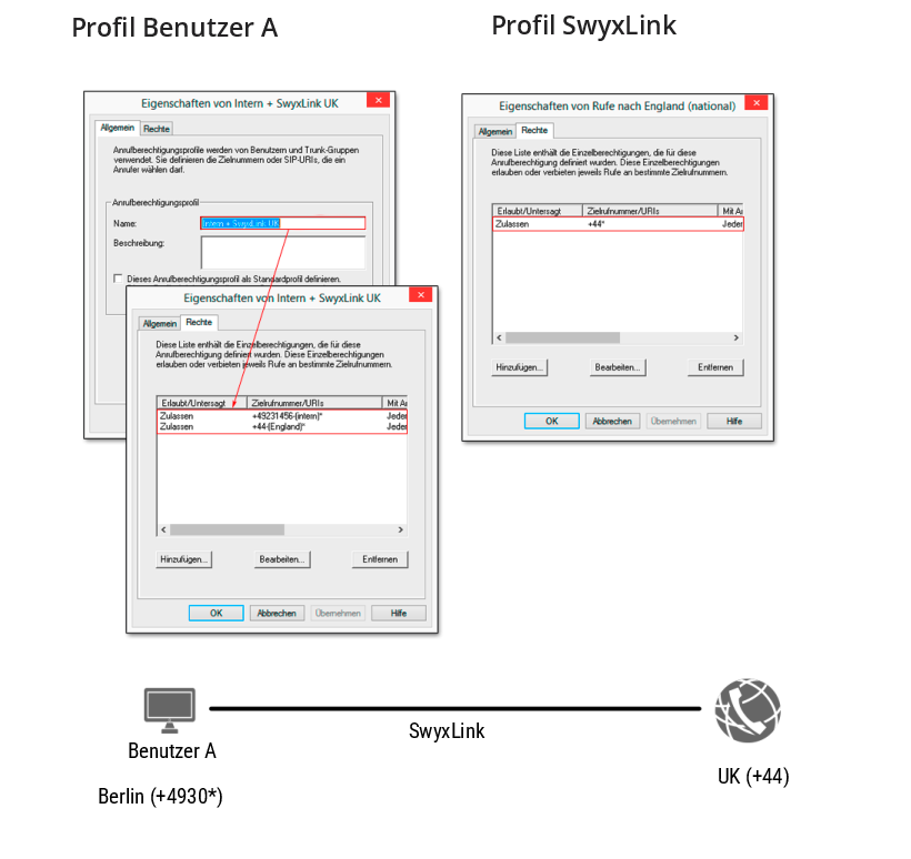 Eintrag in der Anrufberechtigung für SwyxLinkUK in England: