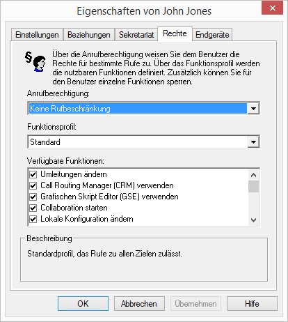 Durch das Funktionsprofil wird festgelegt, welche Funktionen von SwyxWare ein Benutzer nutzen kann. Das Profil „Standard“ ist vorkonfiguriert und enthält alle lizenzierten Optionen. Es wird als Profil für alle neu angelegten Benutzer verwandt.