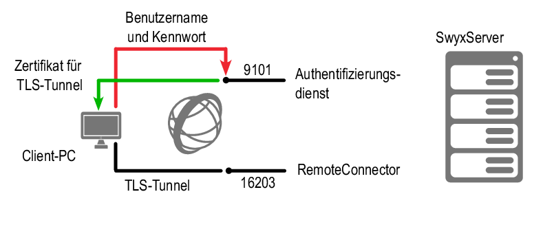 Bei Verbindungsaufbau schickt der Client eine Anfrage zu dem öffentlichen Endpunkt und authentifiziert sich über HTTPS mit dem SwyxWare Benutzernamen und Kennwort. Die benötigten Konfigurationsdaten für den TLS-Tunnel (u. a. der Client-Zertifikat und die Server-Adresse des RemoteConnectors) werden auf den Client-Rechner (bzw. Smartphone) übertragen, für die zukünftigen Verbindungen gespeichert und später nach Bedarf aktualisiert: