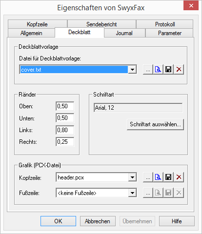 . Die PCX-Datei wird anschließend in die Datenbank geladen (Kategorie „Fax Cover Graphics“) und als Kopf- bzw. Fußzeile für die Titelseite verwandt. Siehe 7.5.9 Registerkarte „Dateien“.