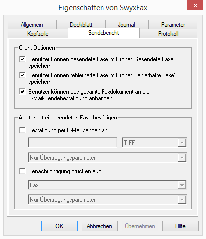 Hier legen Sie fest, ob eine Versandbestätigung nach einem erfolgreich versendetem Fax per E-Mail verschickt und/oder ein Ausdruck erzeugt wird.