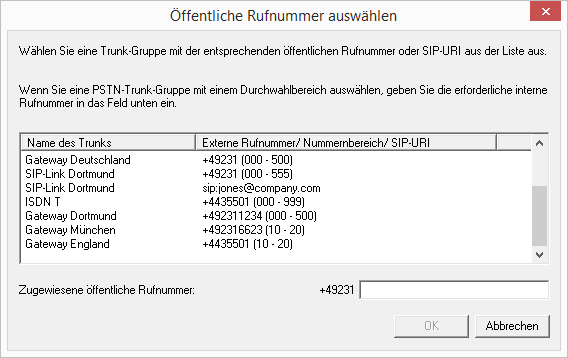 Soll die interne Rufnummer aus dem öffentlichen Telefonnetz angerufen werden können, muss ihr eine externe Rufnummer zugewiesen werden. Sie können diese öffentliche Rufnummer direkt in das Feld eingeben oder auf „Auswählen...“ klicken.