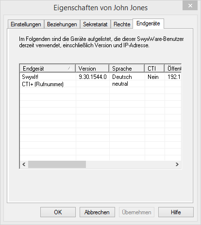 Unter der Registerkarte „Endgeräte“ in den Benutzereigenschaften ist der Eintrag „CTI+ (Rufnummer)“ bei den benutzten Endgeräten zu sehen.