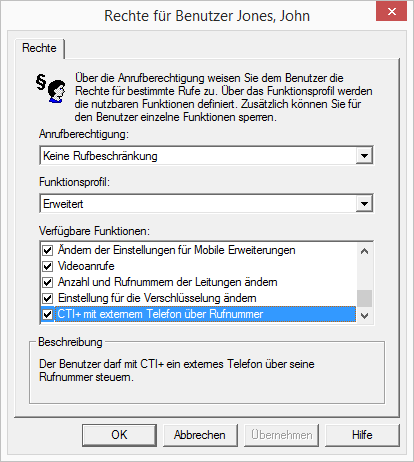 3 Aktivieren Sie unter „Verfügbare Funktionen:“ die Option „CTI+ mit externem Telefon über Rufnummer“.