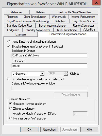 Legen Sie die Datei und das Verzeichnis fest, in der die Einzelverbindungsinformationen von SwyxServer abgelegt werden sollen.