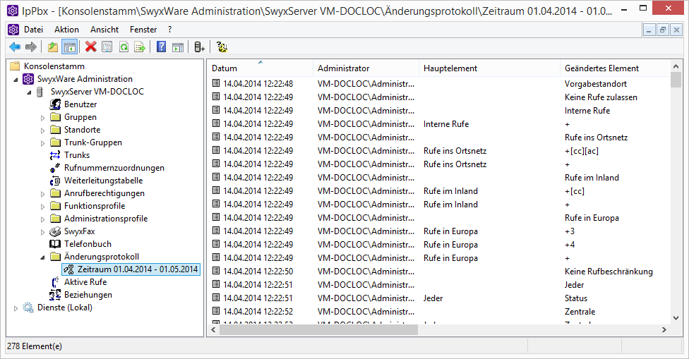 Die Änderungen werden in der Datenbank abgelegt. In der SwyxWare Administration werden im Verzeichnis „Änderungsprotokoll“ die Änderungen zu Zeiträumen gruppiert.