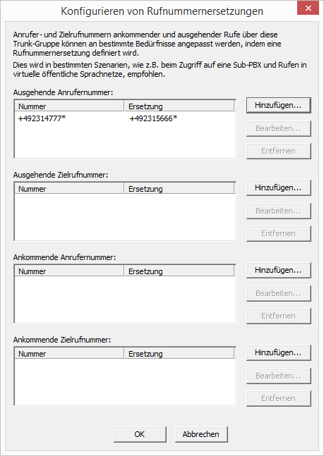 Möchten Sie eine automatische Rufnummernersetzung hinzufügen oder bearbeiten, so öffnet sich ein weiteres Fenster.