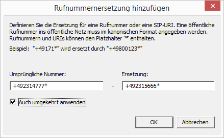 Aktivieren Sie das Kontrollkästchen „Auch umgekehrt anwenden“, so gilt diese Ersetzung in beide Richtungen, d. h. es wird die ankommende Anrufernummer ersetzt und umgekehrt die ausgehende Zielrufnummer, sowie die ankommende Zielrufnummer und die ausgehende Anrufernummer.