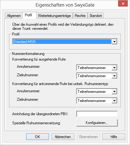 Innerhalb einer Trunk-Gruppe wird festgelegt wie ausgehende Rufnummern konvertiert werden und wie eingehende Rufnummern interpretiert werden. In den Eigenschaften einer Trunk-Gruppe wird über das ausgewählte Profil detailliert festgelegt, welche Rufnummer (ausgehend bzw. eingehend und rufende bzw. gerufene Nummer) in welches Format konvertiert wird. Diese Formatzuordnung kann vom Administrator nachträglich noch verändert werden.
