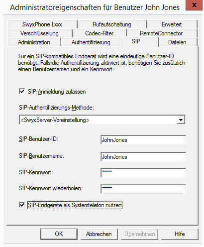 Die Anmeldungsdaten des SIP-Providers werden in der Konfiguration des SIP-Trunks direkt angegeben, die hier angegebenen Daten dienen der internen Anmeldung des SIP-Endgerätes an SwyxServer.
