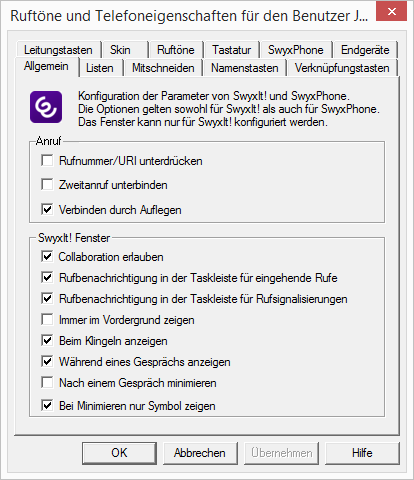 Im unteren Bereich lassen sich Einstellungen zum allgemeinen Verhalten von SwyxIt! Classic festlegen, wie beispielsweise das Verhalten des Fensters bei bzw. nach einem Anruf und die Anwendungsfreigabe.