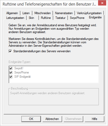 Legen Sie hier fest, welche individuellen Einstellungen für den Benutzer verwendet werden oder übernehmen Sie die Standardeinstellungen des Servers, indem Sie das Kontrollkästchen aktivieren.