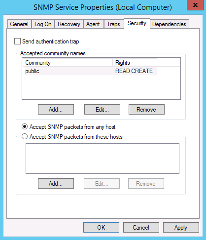 6 Add "public" to the list under "Accepted community traps" on the "Security" tab.
