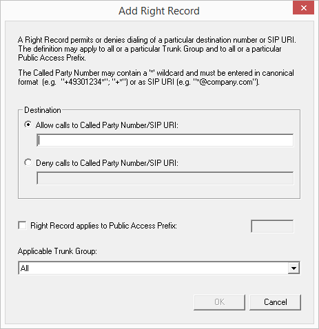 You can specify here whether all trunk groups or only one particular trunk group may be used for the permission defined above.