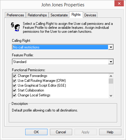 The feature profile determines which SwyxWare functions a user can use. The profile "Standard" is pre-configured and includes all licensed options. It will be used for all new created users.