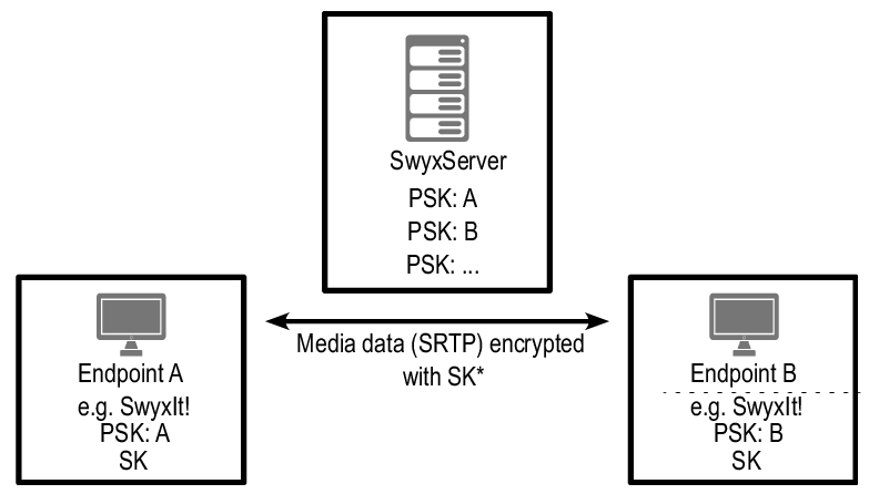 SwyxServer distributes a key (PSK) to each end point logging on. End point A is given PSK "A" and end point B PSK "B".