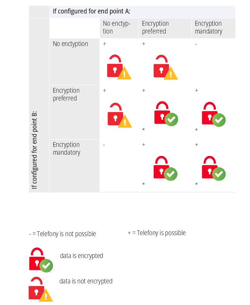 Whether a call is established, and whether it is correspondingly encrypted from end point to end point (e. g. from SwyxIt! Classic to SwyxIt! Classic), is ultimately dependent on the encryption settings within the user properties:
