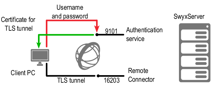 When a connection is established, the client sends a request to the public endpoint and authenticates itself via HTTPS by using its SwyxWare user name and password. The required configuration data for the TLS tunnel (e. g. the client certificate and server address of the RemoteConnector) is transferred to the client computer (and/or smart phone), saved for further connections and subsequently updated as required.
