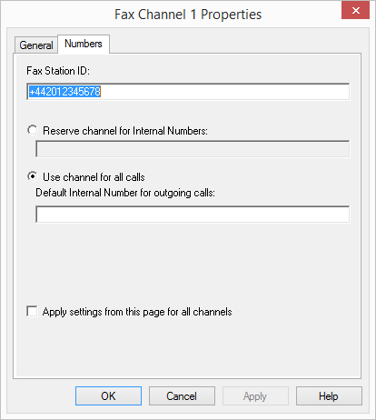 Enter the internal default number here. This number will be signaled to the telephone network when sending a fax. This default number is only used if the SwyxFax Client has configured "Use channel default". Please use only a valid, i.e. an already assigned fax number.