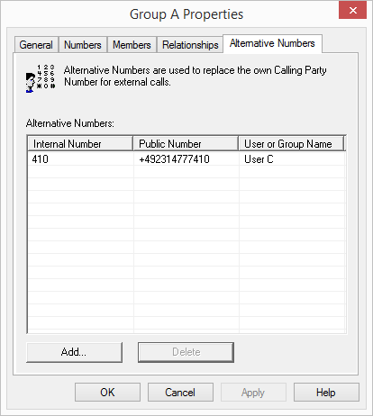 To add an Alternative Number, which the SwyxWare user in this group should signal on outgoing calls, click on "Add...".