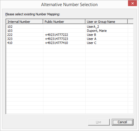You can choose from all numbers which are assigned within SwyxWare and are not allocated to this group. Highlight the alternative number you want, and click "Use". Close the tab with "OK" to save the changes you have made.