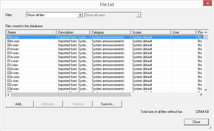 User files are assigned to an individual user. Only the user himself, an administrator or SwyxServer, if e.g. it processes Call Routing Manager scripts, have access to these files. All files generated with a SwyxIt! Classic or the SwyxWare Administration, such as scripts and announcements, are saved as private files. An exception is the file 'Name.wav', which contains the name of the user.