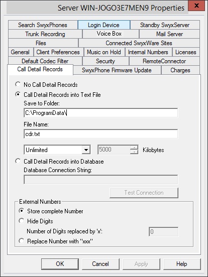 Here, you define the file and the directory where SwyxServer will save the Call Detail Records.