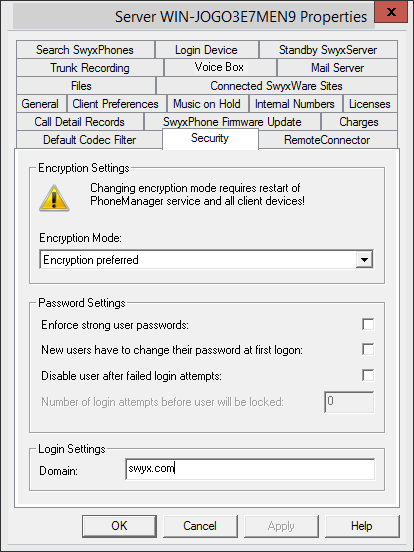 This tab is used to set the encryption mode and password rules for SwyxServer in general.