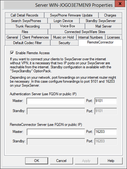 Enter the public server address and the port into the corresponding fields to allow Swyx clients to reach the server via InternetSwyxServer.