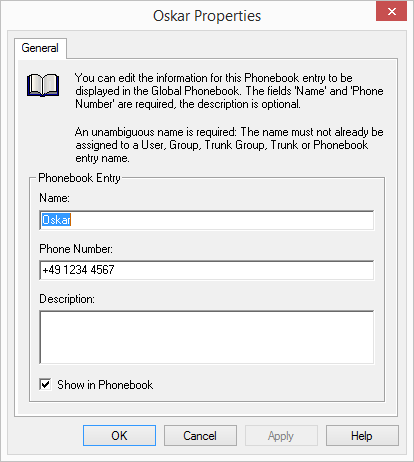 Please note that the name of the phonebook entry must be unique within SwyxWare. This means that no other user, trunk, trunk group, group or external phonebook entry may have the same name. This is checked by the administration.