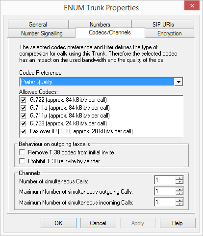 Specify how many channels (connections) should be simultaneously routed over this trunk. You can also determine how many outgoing and/or ingoing connections are established at most.