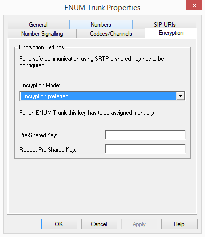 If "No encryption" is selected, the voice data going via this trunk is not encrypted. If the encryption mode was set to "No encryption" within the server properties, the mode is likewise set to "No encryption" here, and cannot be changed. The field is then deactivated.