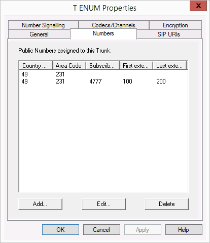 You can specify here which public numbers this trunk uses. External calls to these numbers go over this trunk. Calls with a Calling Party Number that is assigned to this trunk are routed over this trunk.