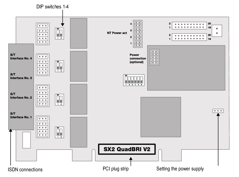 On the right side of the SX2 QuadBRI is a three-pole jumper field for setting the PCI bus power supply.