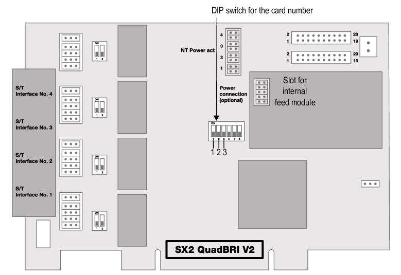 You can set the card number with the six-pole DIP switch in the middle of the SX2 QuadBRI.