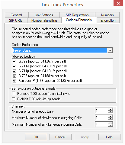 Specify how many channels (connections) should be simultaneously routed over this trunk. You can also determine how many outgoing and/or ingoing connections are established at most.