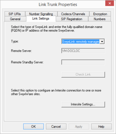 The "Type" field indicates where the SwyxLink trunk is managed. If it is managed locally, i.e. by the SwyxServer on which the SwyxWare Administration is currently logged in, you will see the names of the computers on which this SwyxLinktrunk is managed remotely under Remote server. Please note that you can only change these settings on the site on which the SwyxLink trunk is locally managed.