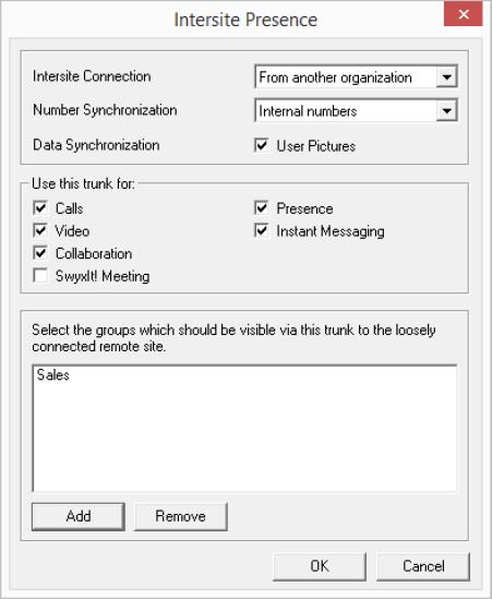 You can use the "Intersite Settings..." button to configure a connection to one or more SwyxServers, in order to make user data and status information visible. This configuration means that status information ("Logged off", "Away", "Do Not Disturb", "Speaking" etc.) can be exchanged between users who are logged in to different SwyxServers. A distinction is made between a connection to a SwyxServer within a user's local organization, and to a SwyxServer outside the local organization.
