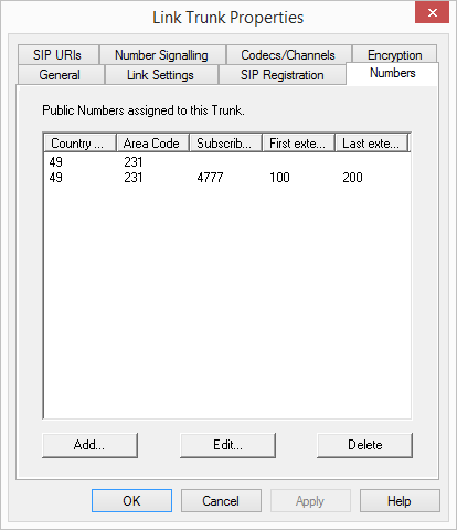 You can specify here which public numbers this trunk uses. External calls to these numbers go over this trunk. Calls with a Calling Party Number that is assigned to this trunk are routed over this trunk.