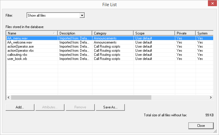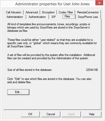 In the SwyxWare installation, global files such as ring tones, announcements etc. are created for all users. In addition, further files can be created specifically for this user. For example, the user can record his own announcements or generate his own scripts. These user-specific files can be edited by the administrator here.