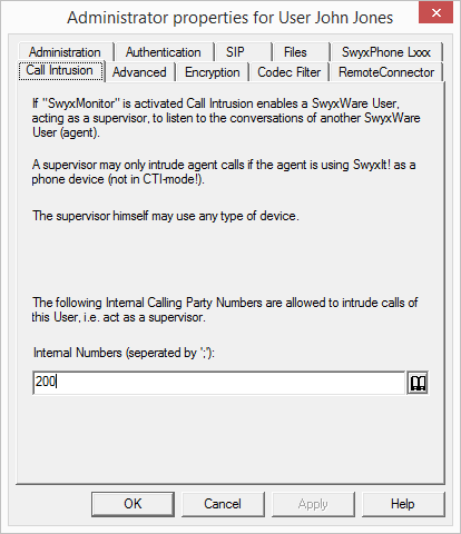 Specify here which internal numbers may intrude into this Agent's calls. You can enter both group numbers and several numbers separated by semicolon. The permission to intrude relates to all this Agent's numbers.
