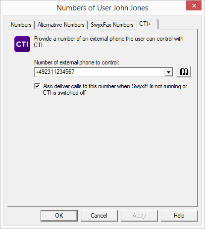 On the CTI+ tab, you define the link to a number, with which the user can control an external phone. With the option "Also deliver calls to this number when SwyxIt! Classic is not running or CTI is switched off" you ensure that incoming calls are forwarded to the external phone independently from SwyxIt! Classic, even if the computer of the user is shut down or CTI is deactivated.