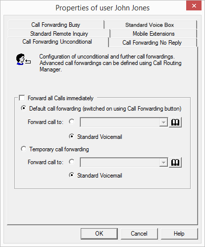 You can specify a default or temporary destination for forwarding of all calls for this user. Options here include Call Forwarding to another number or to Standard Voice Box. If the number field remains empty, no Call Forwarding is performed.