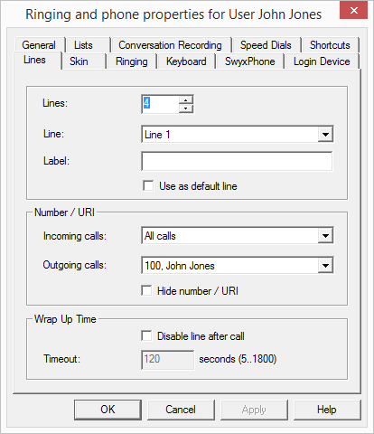 A wrap up time between 5 and 1800 seconds can be defined for each line here. If the checkbox is activated, the line is blocked for further calls during this time period after every incoming call.