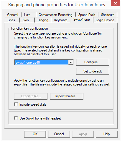 Here you can assign the buttons of the telephone (only - SwyxPhone L 620 does not have keys to assign) and import or export this assignment. Select the type of telephone you would like to configure from the dropdown list and then click on "Configure…". A new dialog with the properties of the selected telephone will open.